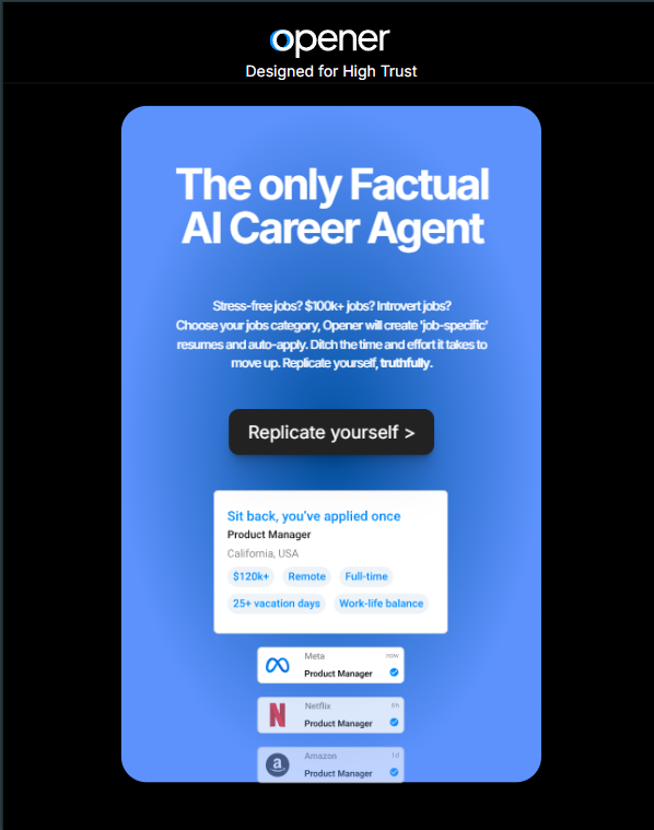 As a leading AI consulting force, we engineered Opener – the world’s first Factual AI Career Agent, transforming how professionals discover and land jobs without the stress of traditional applications.